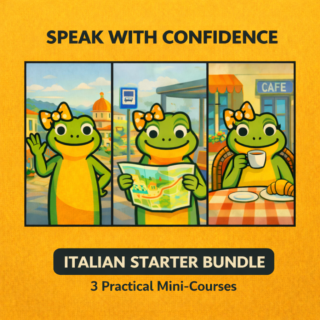 Three beginner-friendly mini-courses that help you confidently speak Italian in real-world situations using VIDEO instruction, AUDIO practice, and concise PDF guides.